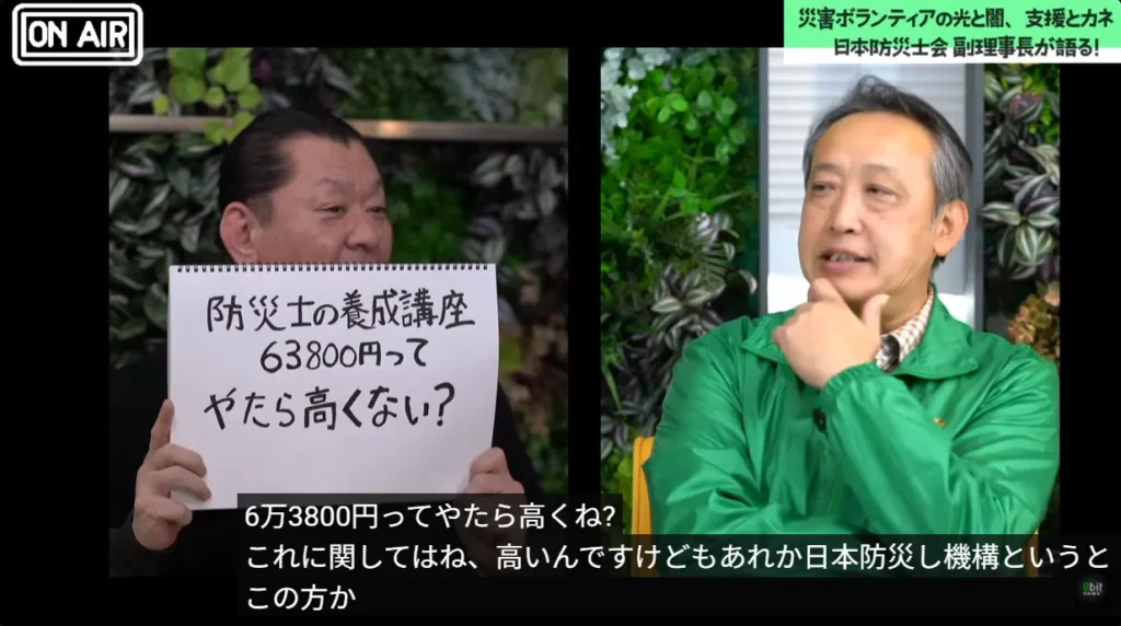 防災士の養成講座が高額であることについて、日本防災士会の副理事長が「確かに高い」としつつ、値段を決めているのは日本防災士会ではなく「日本防災士機構」のためなぜその価格設定になっているかはわからないそうです。