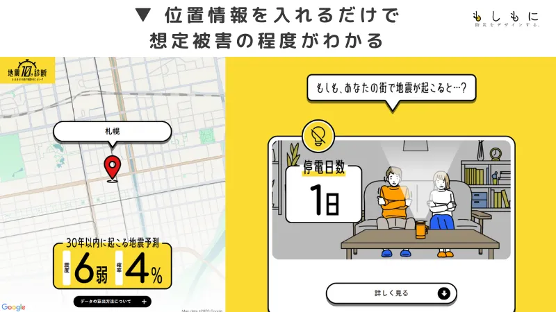 まずは、「地震10秒診断」を実施してみてください。PCやスマホの現在地の共有を許可していただいた上で「診断する」ボタンを押すだけで、危険度がわかります。